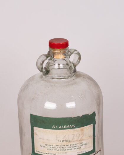Vintage St. Albans 5 litre glass essence flavouring bottle with red cap. "Flammable Liquid". Good condition for age, labels peeling.