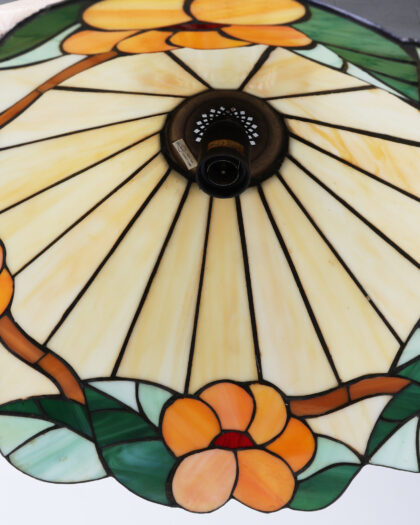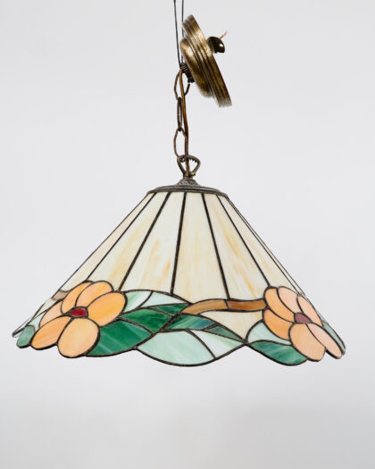 This vintage ceiling light features stained glass in a cream and orange floral design. The stained glass is arranged in a cone shape, with cream-coloured panels at the top and a border of orange flowers and green leaves around the bottom. The flowers have red centres and are set against a background of light green glass. The glass is held together by dark metal seams. The fixture and chain are made of brass, showing signs of age. This ceiling light would make a decorative addition to any room in the home. Slight crack in one of the panes