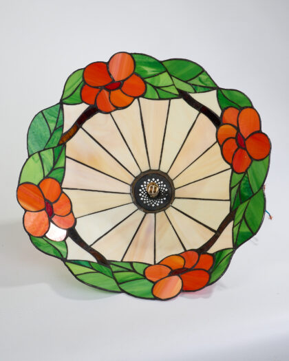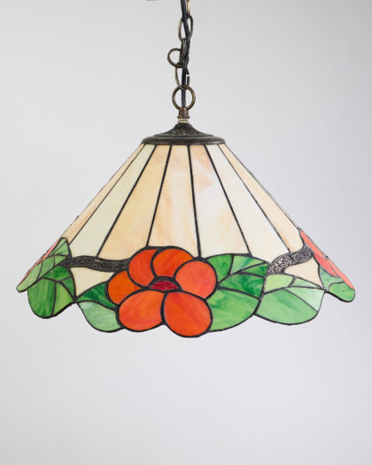 Vintage stained glass pendant light featuring orange flower and green leaf design. Cream coloured glass panels. Chain fitting. Good condition.