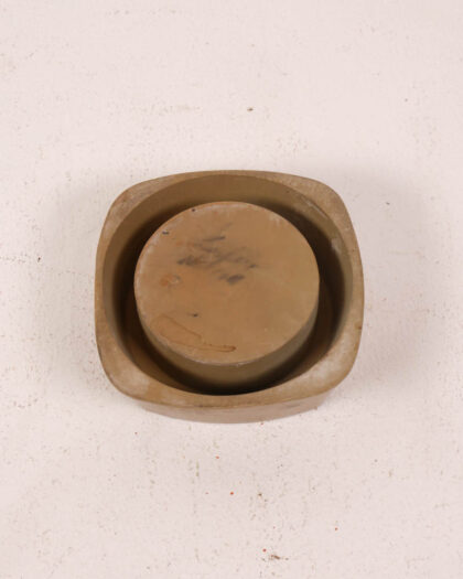 This is a contemporary flower frog crafted from stone, featuring a vibrant orange ceramic insert. The stone base has a smooth, rounded square shape, providing stability, and has a neutral brown color. The ceramic insert adds a pop of color, creating a striking contrast. The flower frog is designed to hold flower stems in place, allowing for creative and beautiful floral arrangements. It would be ideal for displaying on a table or shelf.