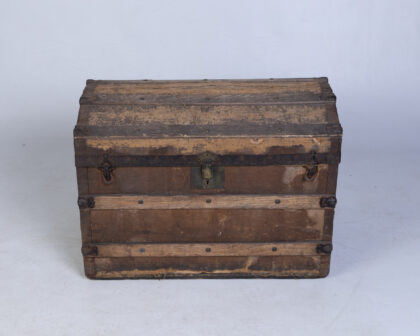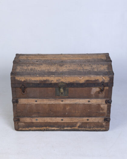 Vintage steamer trunk with wood and metal detailing. A functional storage piece with rustic charm. Perfect for vintage decor.