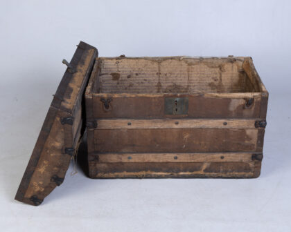 This is a vintage steamer trunk. The exterior is made of wood with metal hardware, including corner protectors and straps. The interior is bare wood. It is a practical storage solution, can be used as a decorative item, or as part of a vintage display.