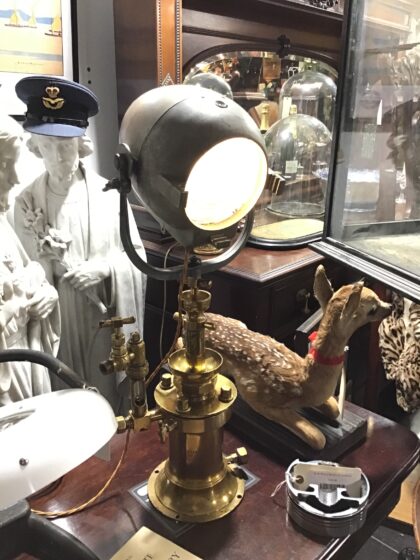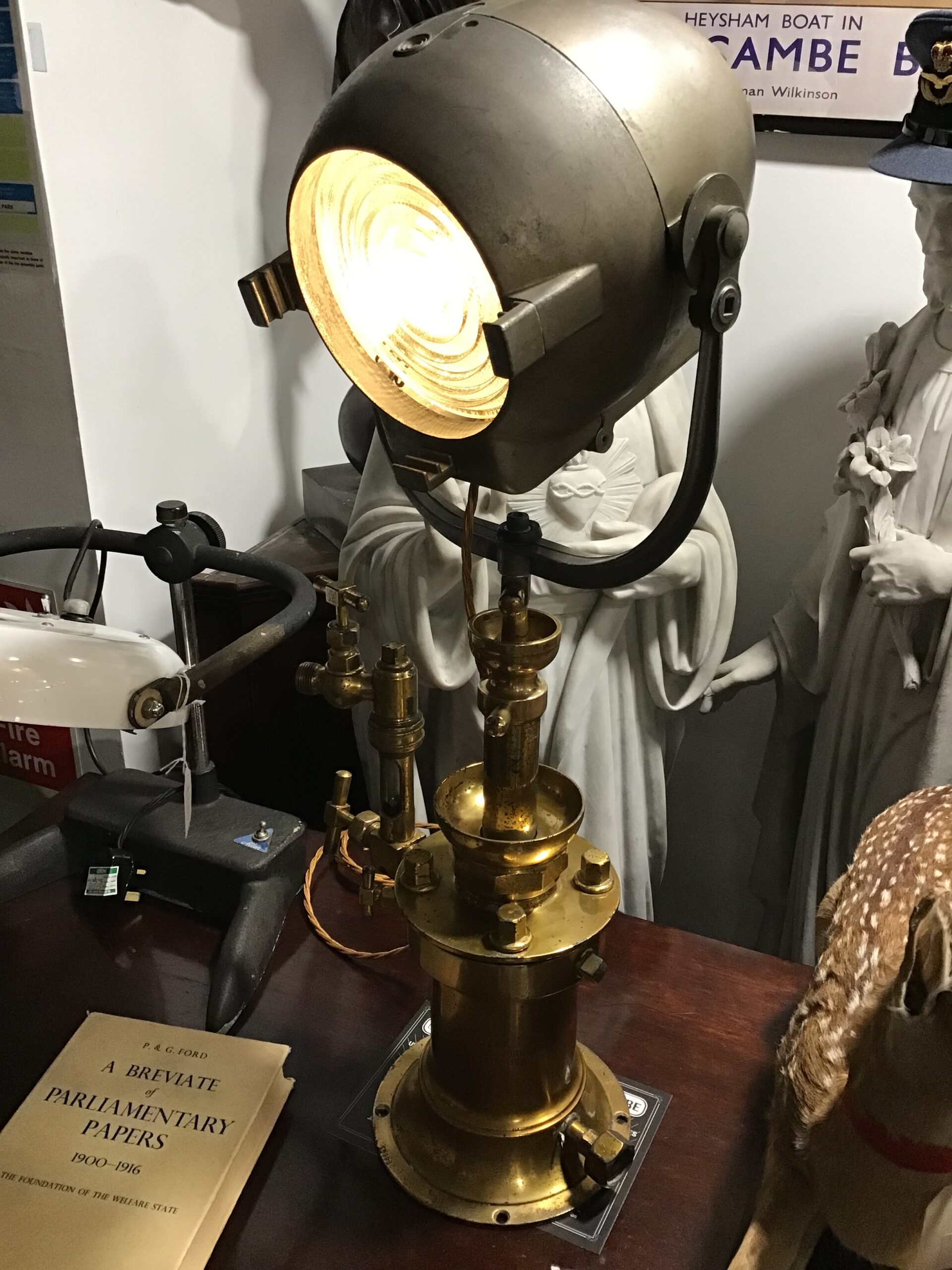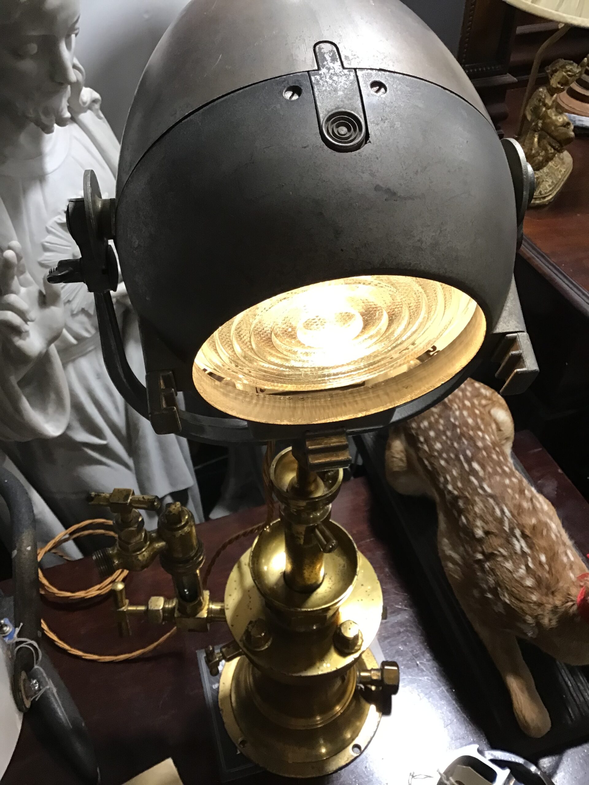 Retro style theatre lamp and intricate brass engineering combine to create this stunning table lamp, all rewired, tested, and ready to light up an interesting corner of your home or office.