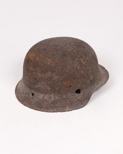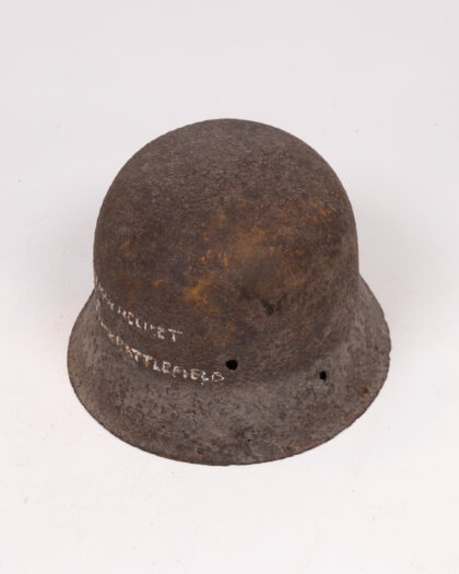Relic WWII German helmet, steel construction, 'battlefield find' inscription. Displays historical wear, ideal military collection piece.