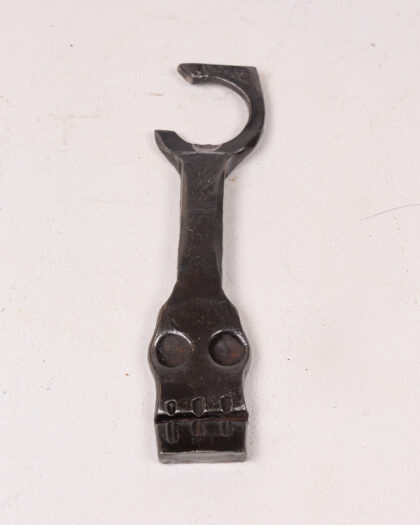 Antique black metal hook tool with unique skull face. A vintage industrial collectible. See description for details.