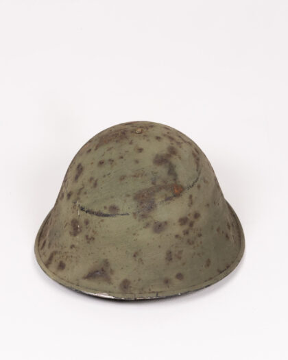 This is a vintage military helmet crafted from steel, showcasing a distressed green finish with rust spots and wear consistent with age and use. The helmet's design is classic, reflecting mid-20th century military equipment. It is ideal for collectors, historical enthusiasts, or as a decorative piece adding character to a home or office space. The overall condition reflects its history and adds to its unique appeal. Perfect for display in a collection or as a conversation starter.