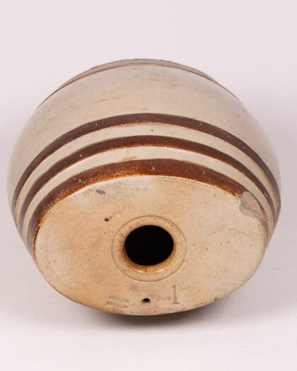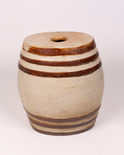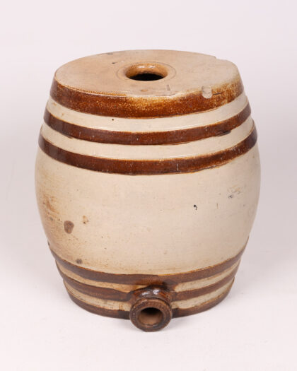 Antique stoneware beer barrel with banded decoration, crafted from durable ceramic. Features a top opening and a spout, suitable for rustic décor or as a unique beverage dispenser. Neutral cream colour with brown band detail. A charming piece with vintage appeal, suitable for both decorative display and practical use. Shows some signs of wear consistent with age and use including some chips to the rim, which adds to its character.