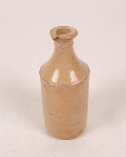 This is a vintage stoneware bottle, perfect for display in a rustic or farmhouse setting. The bottle features a narrow neck and a cylindrical body. The stoneware has a lovely textured finish in neutral brown tones. There are signs of age and wear consistent with its vintage origin, which only adds to its appeal. Overall, this bottle is in good condition and would make a great addition to any home.