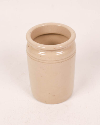This is an antique stoneware jar featuring a two-tone colour scheme. The upper portion of the jar is a rich brown, while the lower half is a creamy beige. The jar has a wide mouth and a cylindrical body. The stoneware has a slightly rough texture. There are some chips and imperfections around the rim, which is consistent with its age and use. The piece has a good patina. It would look well on a shelf or mantelpiece.