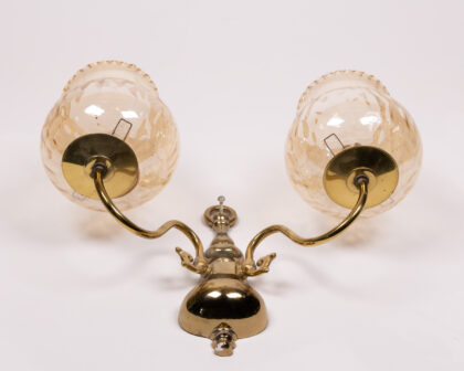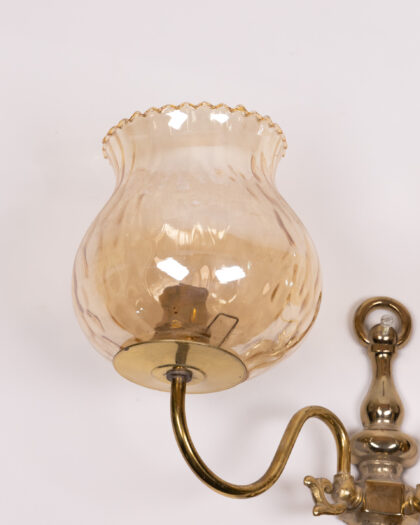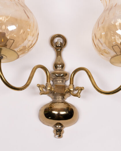 Elegant vintage-style wall light featuring ornate brass detailing and complementary amber-coloured glass shades. This fitting will add a touch of glamour to any room, offering an atmospheric glow to any living space. This pre-owned light has been well maintained and remains in good condition, with only minor signs of wear visible upon close inspection. This charming piece combines functionality with timeless aesthetics.