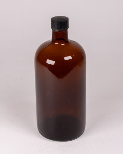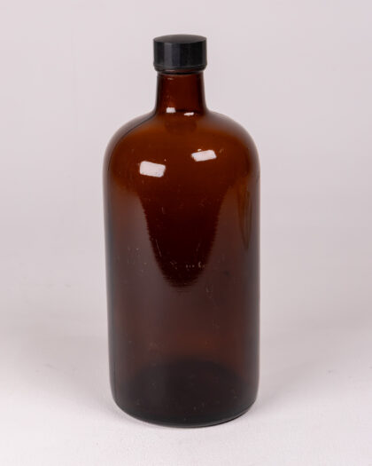 Vintage brown glass apothecary bottle with a black plastic lid, perfect for adding retro charm or practical storage to your home.
