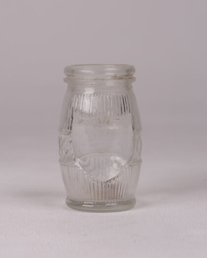Vintage clear glass barrel jar, ideal for small storage or decorative display. Features ribbed design and classic charm.