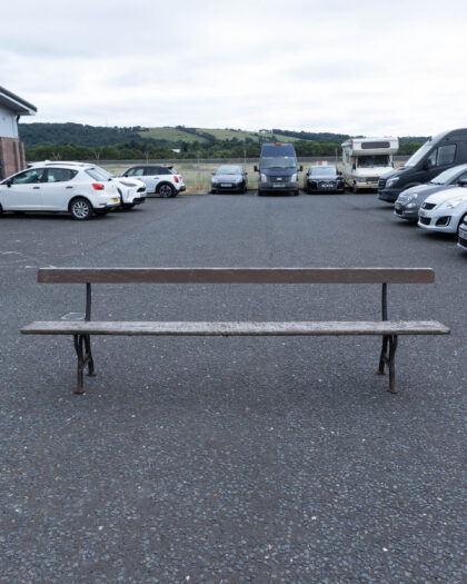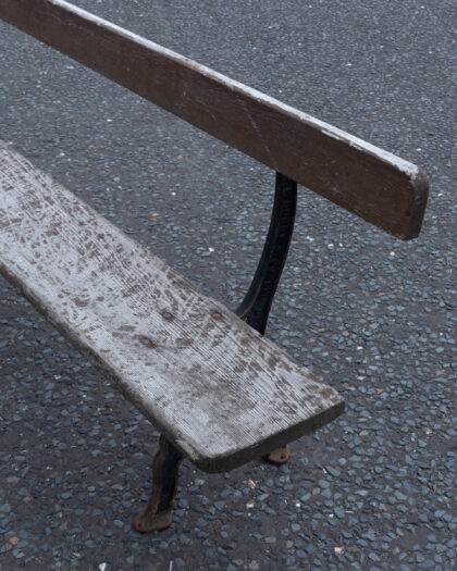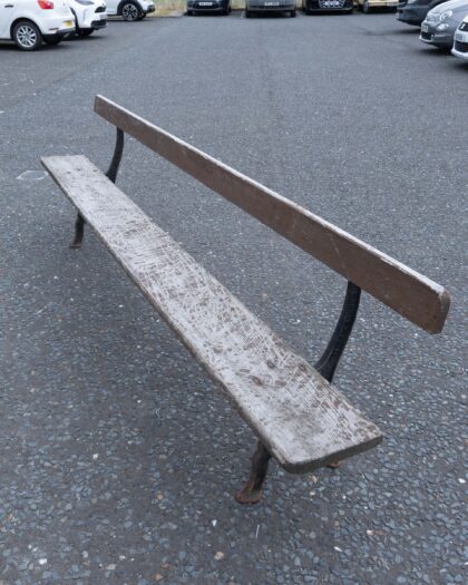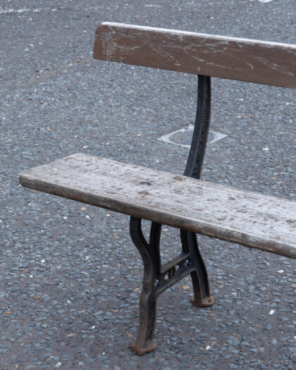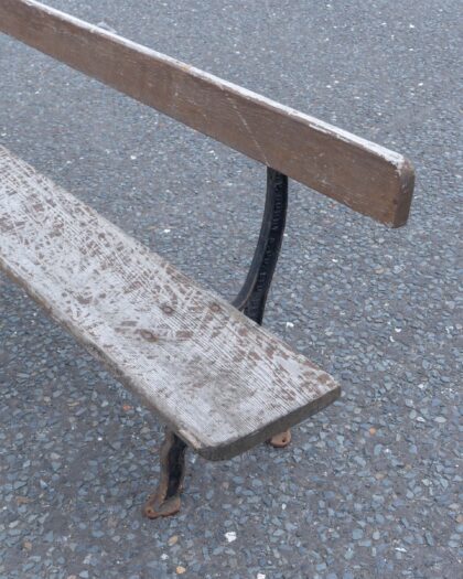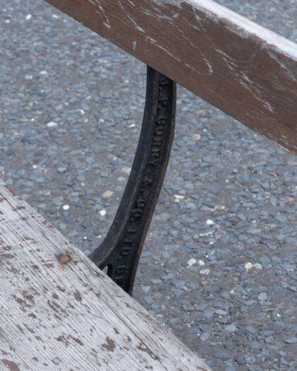 Authentic vintage garden bench by J.P. Corry & Co. Ltd Belfast, featuring weathered wooden slats and ornate cast iron legs. A unique outdoor seating choice with genuine rustic charm.