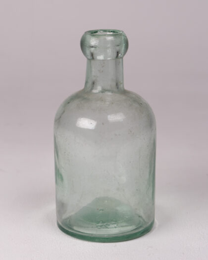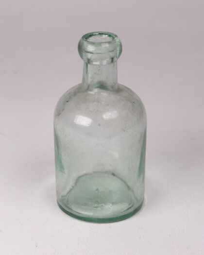 Discover this charming vintage green glass bottle, a perfect decorative accent for any space. Crafted from clear green glass, its classic design features a distinctive round body, a gracefully narrow neck, and a charming rounded lip. This unique bottle adds a touch of timeless appeal to a collection, a shelf, or a side table. Presented in good condition, it's ready to enhance your home decor.