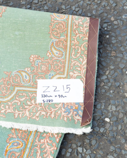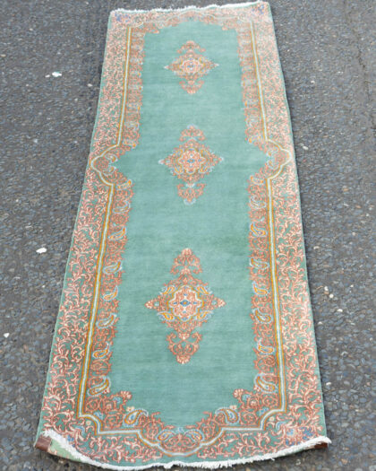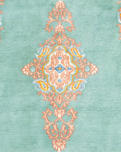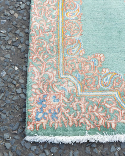 This vintage-style rug features a pale green base colour adorned with detailed floral medallion designs in orange and blue. The rug is made from wool and features an intricate border pattern that complements the central medallions. The colours are soft and muted, giving it a vintage aesthetic. The rug is in good condition, ideal for adding a touch of colour and texture to various spaces in the home.