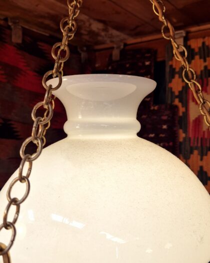 This is a stunning antique-style hanging lamp, perfect for adding a touch of vintage elegance to any room. The lamp features a beautiful white frosted glass shade that diffuses light softly, creating a warm and inviting ambiance. The fixture is crafted from brass, giving it a rich, golden hue that complements the shade perfectly. The lamp hangs from a decorative brass chain, adding to its overall vintage charm. The condition of the lamp appears to be excellent, with no visible signs of damage or wear. This piece would be a wonderful addition to a living room, dining room, or bedroom, and would certainly be a conversation starter.