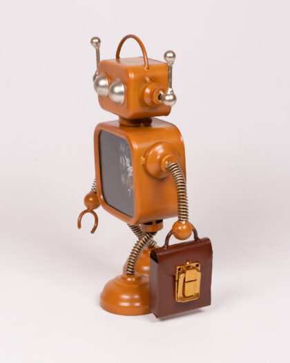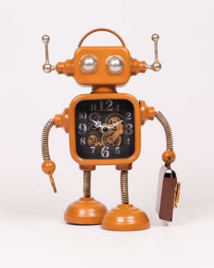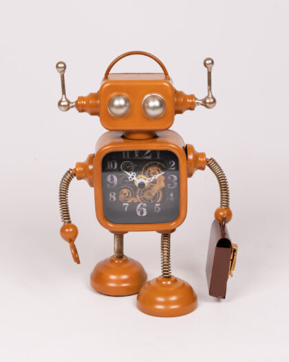 This charming clock is designed in the shape of a vintage-style robot. The robot's body features a clock face, with numbers around the perimeter and decorative gears visible underneath the clock hands. The robot is made of metal with a distinctive orange colour. Its head has antennae and silver button eyes. The robot has spring arms. In one hand it carries a brown case with gold coloured clasp. It would make a quirky addition to any shelf, desk, or mantlepiece.