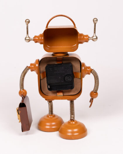 Orange robot clock with a vintage-inspired design. Metal construction, with a clock face in its body and spring arms and legs. A unique décor piece.