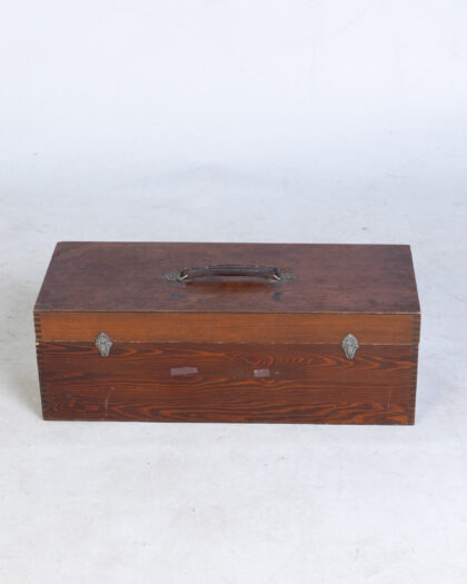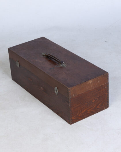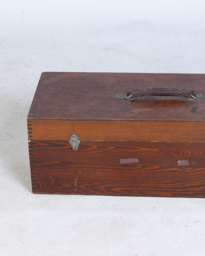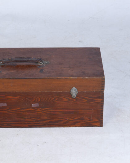 Vintage stained wood storage box with hinged lid, metal hardware, and leather handle. Perfect for keepsakes, tools, or rustic home decor.