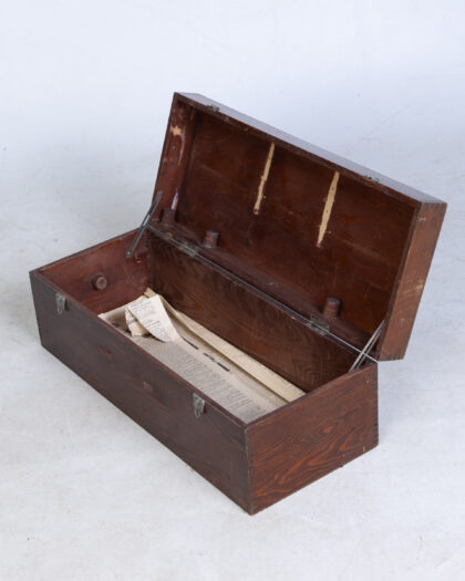 Discover this charming vintage stained wood storage box, a truly authentic piece perfect for adding rustic appeal and historical charm to any space. Crafted with robust stained wood, it features a sturdy hinged lid secured by decorative metal hardware, including a functional latch and reinforced corners. A comfortable leather handle on top ensures easy transport. The interior reveals a unique lining of old newspaper, enhancing its genuine character and providing a glimpse into its past. In good condition consistent with its age, this versatile box is ideal for storing keepsakes, tools, or simply as a distinctive decorative accent in your living room, home office, or study.