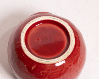 This charming lidded jar is made from ceramic and shaped like a beetroot. The lid is topped with leaves. The main colour is red, and the leaves are green. The word 'BEETROOT' is embossed across the top of the beetroot section. The jar has a quirky face, complete with eyes, a nose and a smile. There is a hole in the lid, presumably for a spoon. The base is marked P3145. This vintage jar would be perfect for display or for practical storage, and is in very good condition.