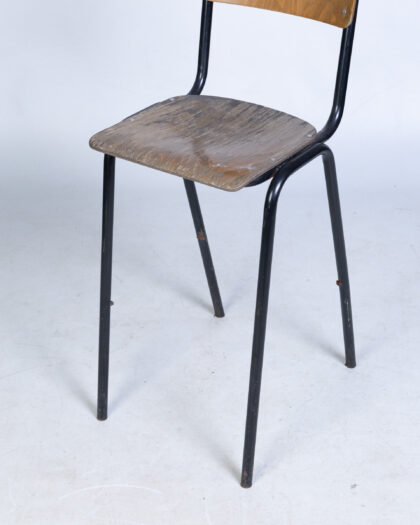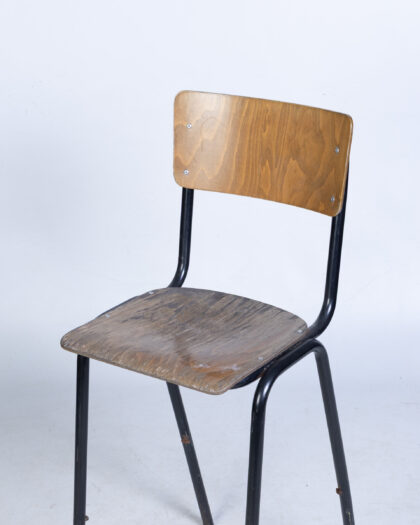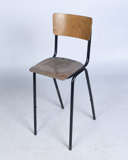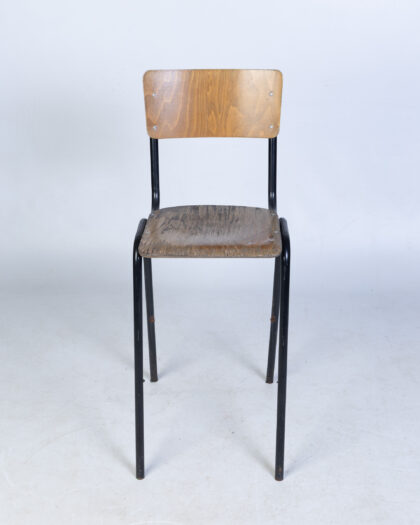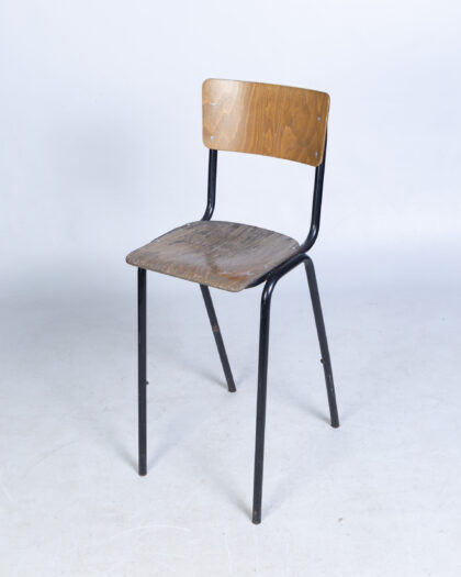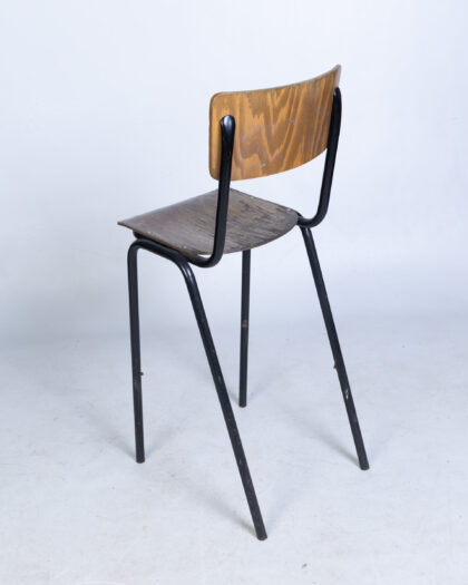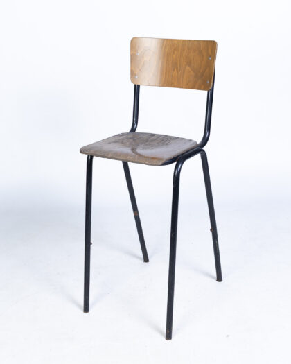 Vintage tall school chair with a black tubular steel frame and wooden seat and back. The wood has a warm tone and visible grain, complemented by the contrast with the black metal frame. This chair exhibits a simple and functional design, typical of school or industrial furniture from the mid-20th century. Signs of wear consistent with age, which could include minor scratches, and slight discolouration on the wooden elements, adds to its vintage charm. Solid and sturdy, this chair would make a distinctive seating option for a variety of spaces.