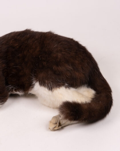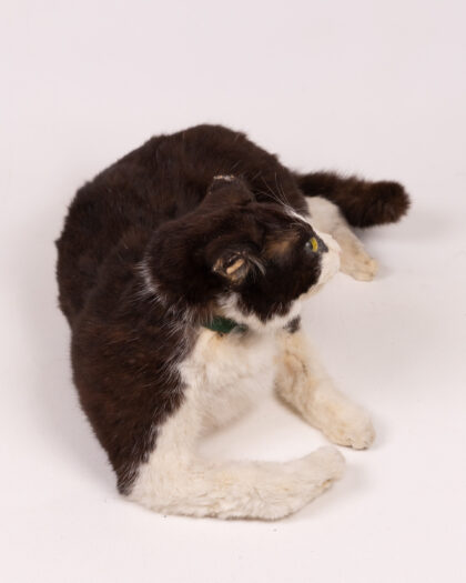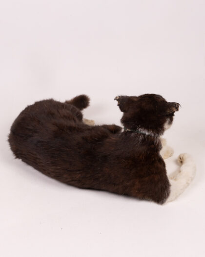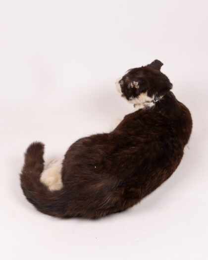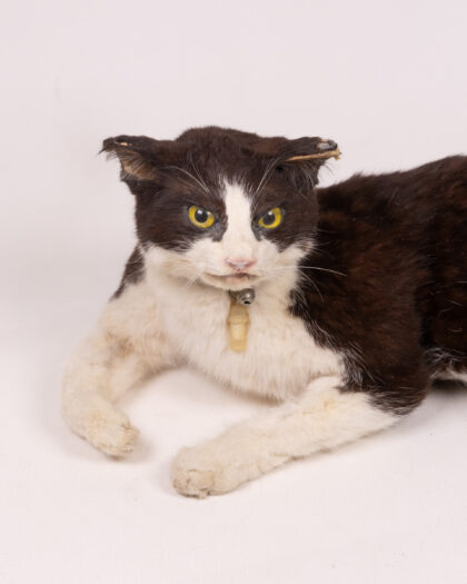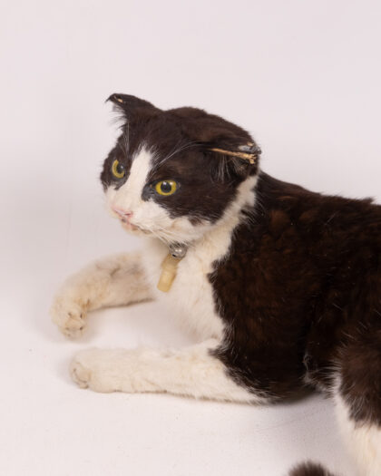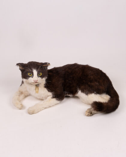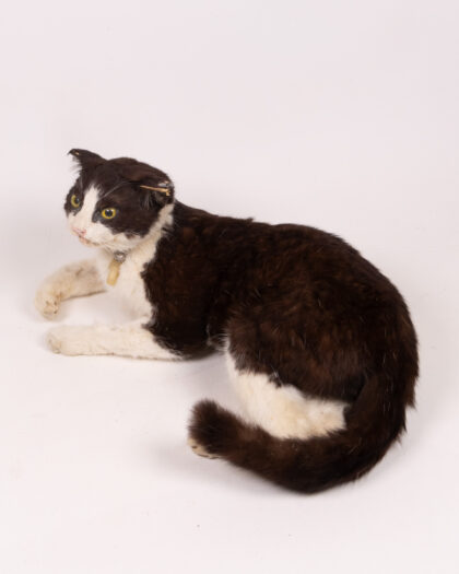 This is a vintage taxidermy tuxedo cat (felis catus). She is dark brown, with white tuxedo markings on her face, chest, and paws. She has yellow eyes and is wearing a green collar with a small container attached. Inside the container is an aged strip of paper with the name 'Cleopatra' on it, presumably the cats name in life (and death?)