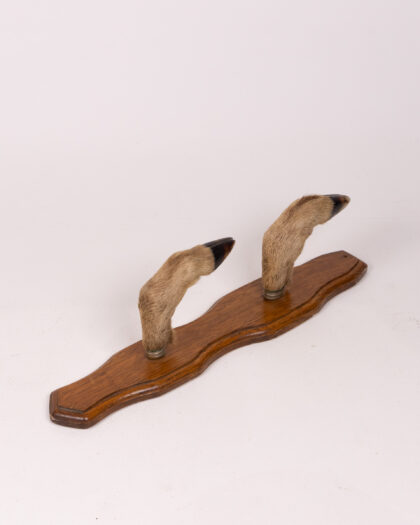 Vintage taxidermy coat hook, crafted from a deer’s leg and foot and mounted on a wooden backplate. A quirky and unique accessory.