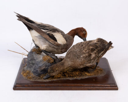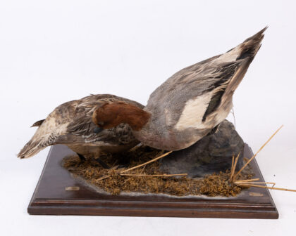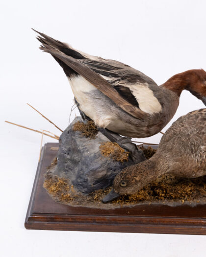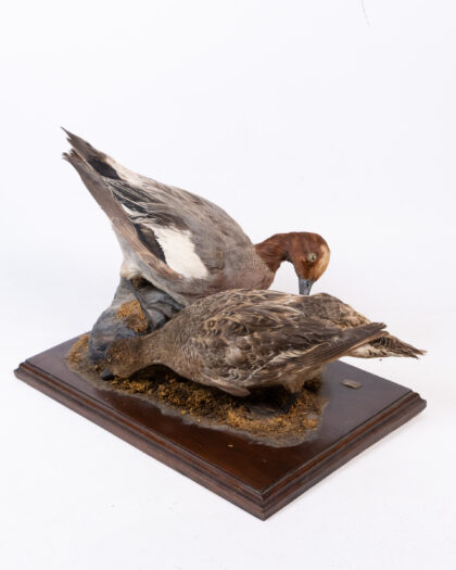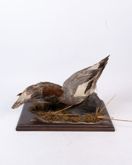 A taxidermy display featuring two teal ducks (anas crecca), mounted on a naturalistic base. The base includes a dark-stained wooden platform with decorative edging, a faux rock, and simulated moss and dried grass. One duck is standing and facing forward with detailed brown plumage, while the other is slightly lower, facing down as if feeding. The overall effect is a vintage-style nature display, suitable for adding a touch of rustic charm to a study or living room. Condition is good, with some slight fading of the wood stain.