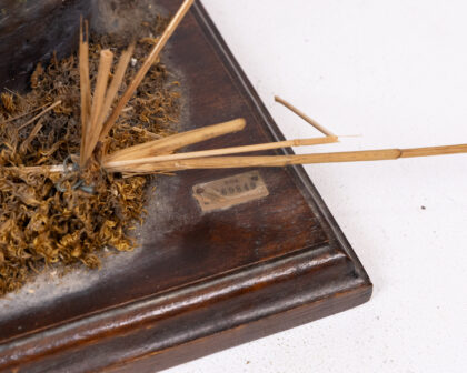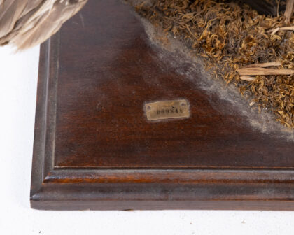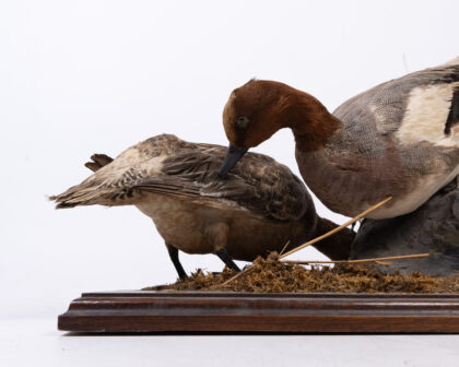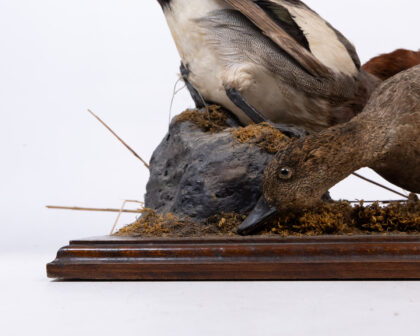 Vintage taxidermy display featuring two mounted ducks on a wooden and faux-moss base. A unique, nature-inspired decorative piece!