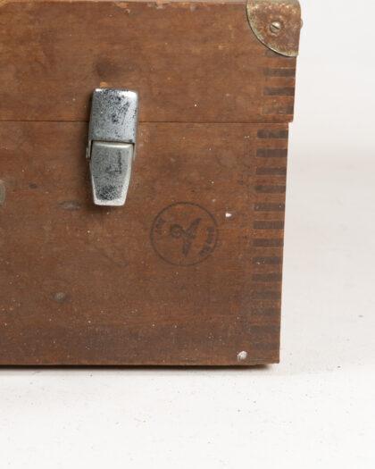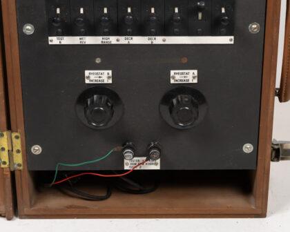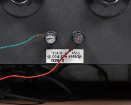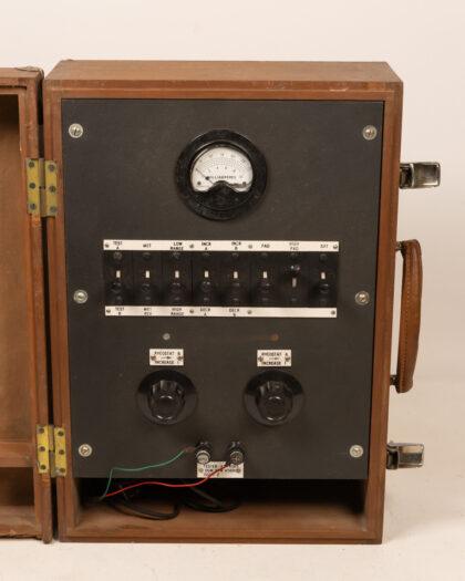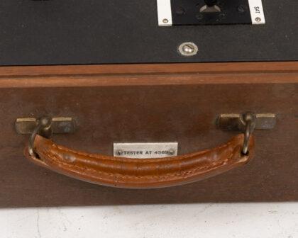 This is a vintage Tester AT 4569 electrical test unit, housed in a sturdy wooden case with a hinged lid and metal latches. The unit features a black panel with various dials, switches, and a milliammeter gauge. Marked with 'TESTER AT 4569 DGM ATW 45690 ISSUE 2'. The unit is untested and sold as-is. The wooden case shows some signs of wear commensurate with age, including minor scratches and scuffs. The leather handle is intact. The unit has not been tested and is sold for decorative purposes, collecting purposes, or repair. It is a vintage item. Note: Item is untested, functionality is unknown.