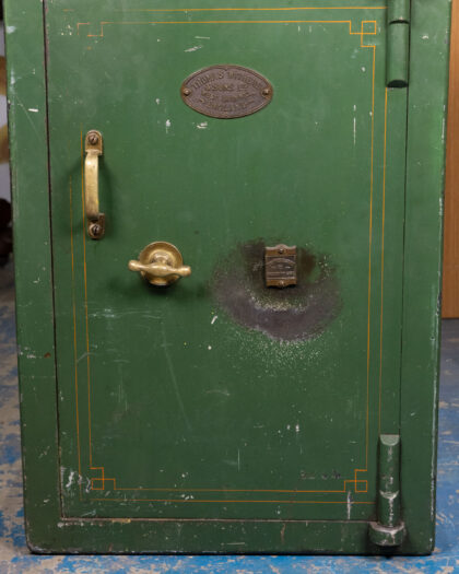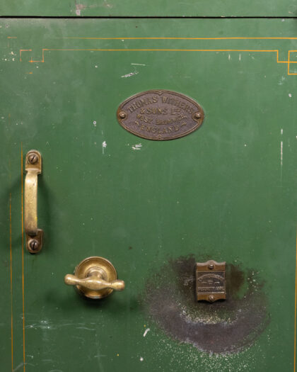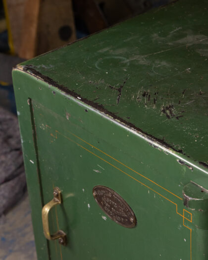 Vintage 'Thomas Withers & Sons' safe in dark green with gold detailing. An industrial storage solution, perfect for a quirky home.