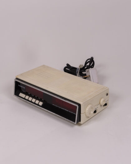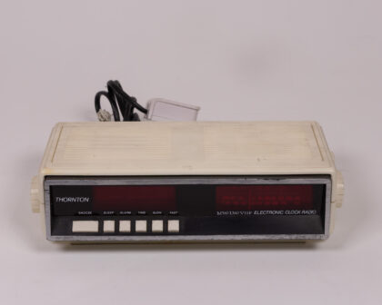 Vintage Thornton MW/LW/VHF electronic clock radio. Features a cream coloured plastic casing with silver tone trim around the face. The clock face has red digits. Has the typical buttons for snooze, sleep, alarm, time, slow and fast. Mains operated with standard UK plug. A practical vintage alarm clock radio for the home.