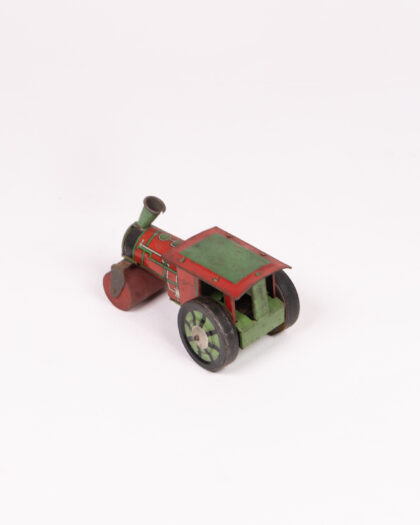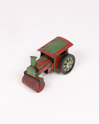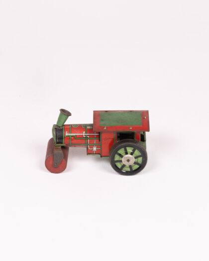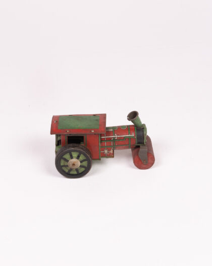 This is a vintage tinplate road roller toy. It features a red body with green roof and wheels. The piece shows some signs of wear consistent with its age and use, including some scratches, paint loss, and minor rusting. It is a perfect display item for a collector of vintage toys or automobilia. It will add charm and nostalgia to any space.