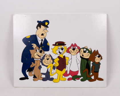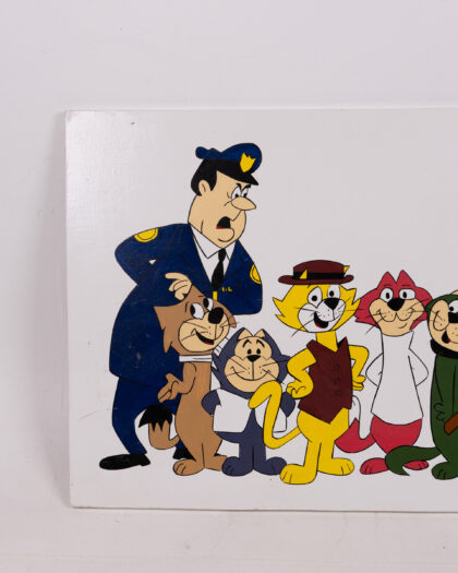 A vintage wooden artwork featuring the Hanna-Barbera cartoon characters Top Cat and Officer Dibble. The artwork is hand-painted on a white wooden plaque. The image shows the Top Cat gang lined up in front of Officer Dibble. The artwork is in good condition with some minor wear and tear on the edges of the wooden plaque. Perfect for a kids' room or a retro cartoon collector.