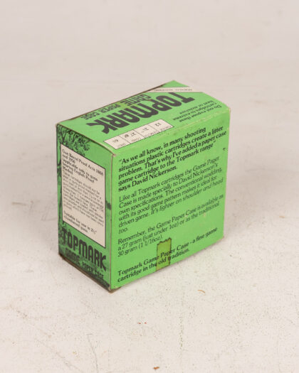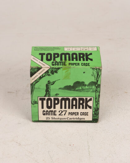 Vintage Topmark Game 27 paper case shotgun cartridges box. This collectible box once held 25 shotgun cartridges. Features include a green paper case, graphics of a hunter, and vintage advertising text. Suitable for use in 2 1/2" chambered guns. A great item for display or the vintage hunting enthusiast. Good condition.