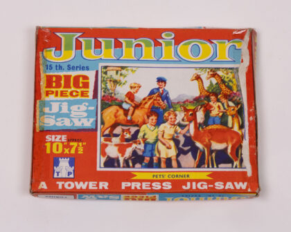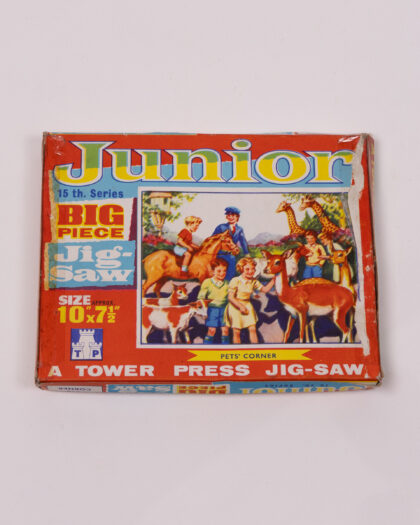 A vintage Tower Press Junior Jigsaw Puzzle in its original box. The box is red, blue, and yellow, featuring an illustration of children with various animals such as horses, dogs, giraffes and deers. The box is marked as the '15th Series' and specifies that it is a 'Big Piece Jigsaw' with an approximate size of 10 1/2" x 7 1/2". The condition of the box shows signs of wear consistent with age, including scuffs and marks around the edges. This item is ideal for collectors of vintage toys and puzzles, or as a nostalgic gift.