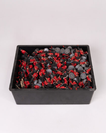 This vintage toy soldier figurine features a red jacket, black trousers, and a grey base, typical of British Grenadier Guards. The soldier is holding a rifle. Ideal for collectors, children's play, or as a unique piece of home decor. It has some age related wear, consistent with play £1 each or 12 for £10.