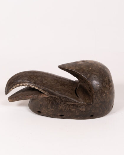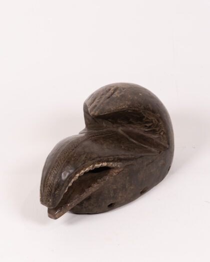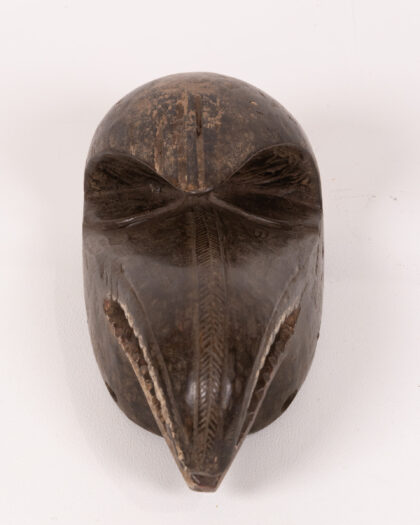 This is a hand-carved tribal mask. It is carved from a single piece of wood and has a smooth, dark brown finish. The mask is in the shape of a bird, with a long, pointed beak and a crested head. There are carved details around the eyes, beak, and head. The mask is in very good condition with some wear to the finish, which is consistent with its age and use. This striking mask would make a great addition to any home.