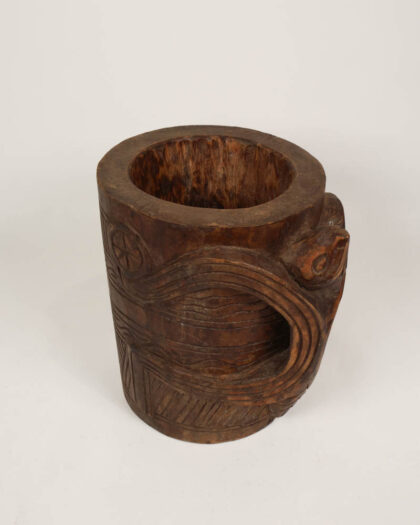 This is a vintage hand-carved wooden pot. The cylindrical pot features an open top and a handle on one side. The exterior of the pot is carved with geometric patterns, including horizontal lines, zigzags, and circular designs. The handle is carved in a curved shape, adding a decorative element to the piece. The wood has a warm brown colour and a slightly weathered appearance, giving it a rustic look. The pot could be used as a decorative planter or a standalone piece, bringing character to any room.