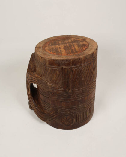 A hand-carved wooden pot with geometric patterns and a handle. Weathered and worn with rich dark tones.