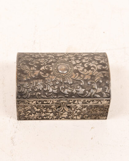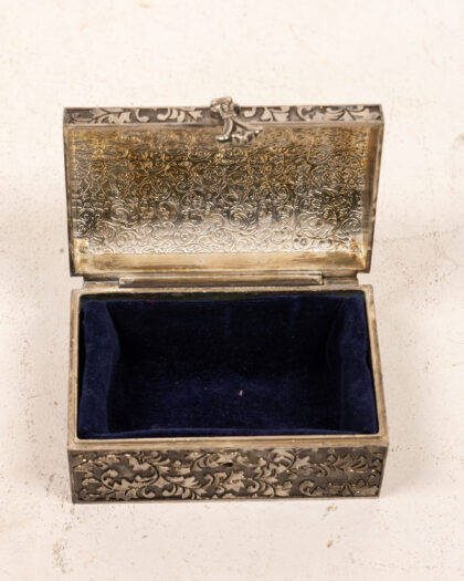 Vintage silver plated trinket box with intricate floral detailing. The box features a hinged lid with a secure clasp. Interior is lined with a rich blue velvet. Some wear and tarnish consistent with age. A charming piece for storing jewellery or small treasures.