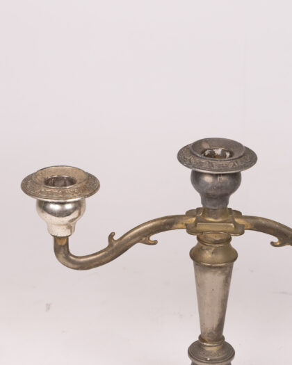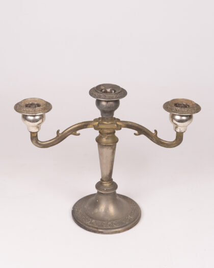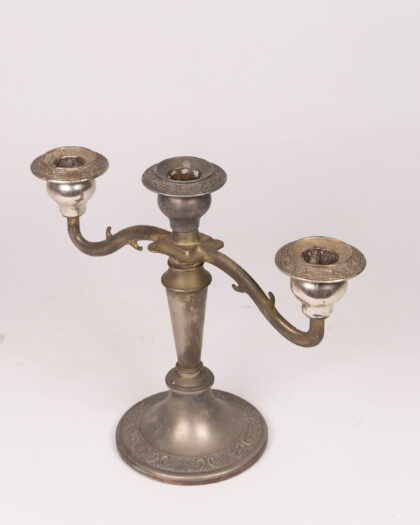 Vintage metal triple candle holder in silver and gold finish. Decorative base and candle platforms. Some signs of wear, adding to its charm.
