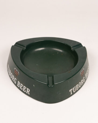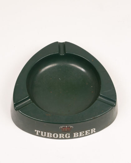 Vintage green plastic ashtray advertising Tuborg Beer. Features the Tuborg Beer logo with a crown. The ashtray has a triangular shape with three cigarette rests and a deep central bowl. Some minor wear and imperfections as expected with age. A great addition to any breweriana collection or home bar.