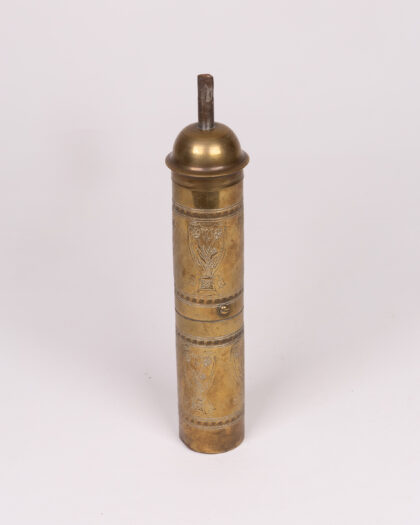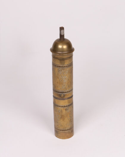 This is a vintage Turkish coffee mill, crafted from brass. The mill is cylindrical in shape, with a domed lid and a handle at the top. The body is decorated with etched designs, including floral motifs and geometric patterns. The brass has aged, giving the mill a warm, golden patina. There is a small handle near the middle. This mill would make a functional and decorative addition to a kitchen or coffee bar.