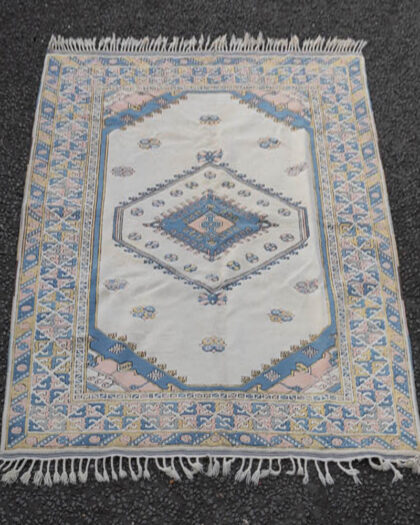 Vintage-style rug features cream background with blue and pink geometric detailing. Wool construction with fringed edges. Good condition.