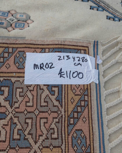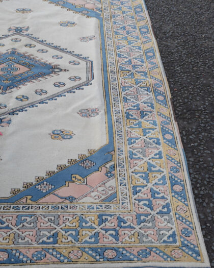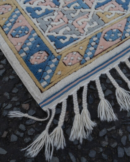This vintage-style rug is hand woven & features a cream background with unique Turkish Kars style patterns in blue, pink, and grey. The central design showcases a diamond shape with smaller floral motifs. The border is decorated with a geometric medallion pattern embossed in pastel shades, adding to its charm. The rug is made of wool and has fringed edges. This rug could be displayed in a living room, bedroom, or any area where a touch of colour and warmth is desired.