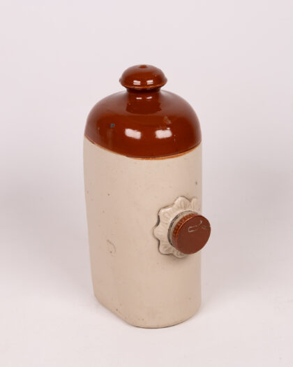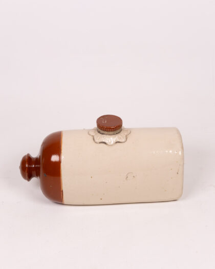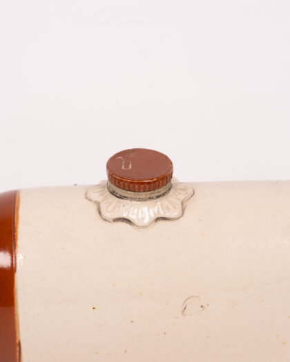 Vintage stoneware hot water bottle with a two-tone cream and brown glaze, featuring a screw-top lid. Ideal vintage home decor!