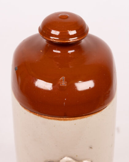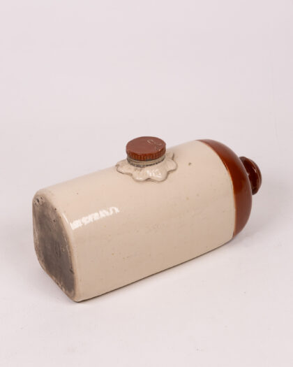 A vintage stoneware hot water bottle with a two-tone cream and brown finish. The top part is a glazed brown with a screw-top lid with a fluted neck. The ceramic has a cream base with slight wear, including scuffs and dark marks, consistent with age. On the base, there is an embossed manufacturer's mark. This bottle would make an attractive decorative piece.