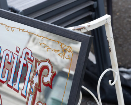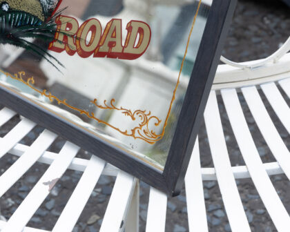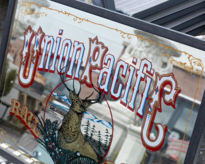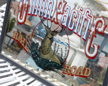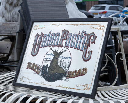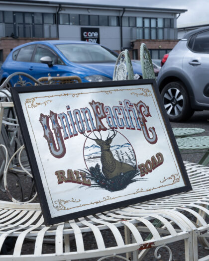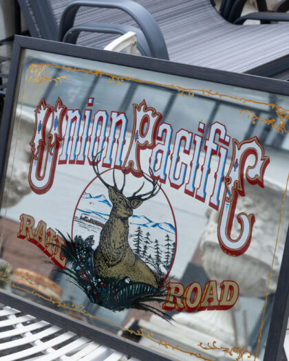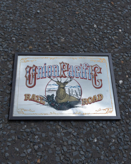 Vintage Union Pacific Railroad mirror sign with a buck deer image and gold accents. Perfect for a home bar or games room.
